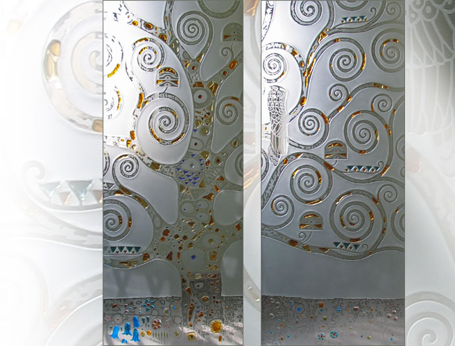 Мотив для создания витражей - картина Густава Климта "Дерево жизни".Витраж создан в технике многоплановой пескоструйной обработки стекла, цветные элементы витража выполнены в технике фьюзинг.